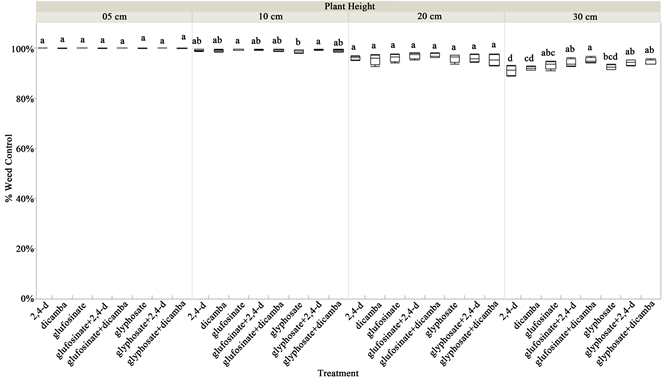 Figure 4. Palmer amaranth percent control at various heights as affected by selected herbicide treatments in trial 2. Boxplots within the same plant height not connected by the same letter (s) are significantly different according to the Student’s t-test (p = 0.05).