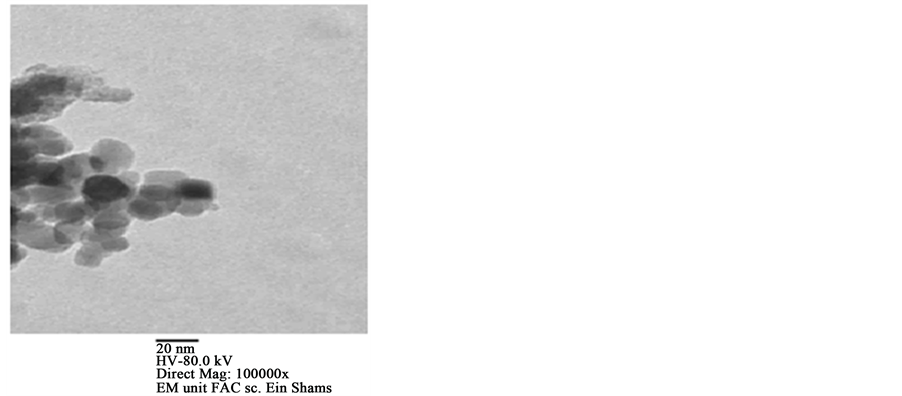 TEM is considered a powerful tool in determining the nanostructure of the prepared sample. It is clear that titania nanoparticles exist in spherical structure with size about 25 nm, Figure 2(a). It is interesting to notice from Figure 2(b) that the malachite dye is strongly attached to titania nanoparticles as various rods linked to titania nanoparticles.