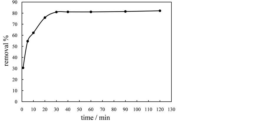 Figure 3. Effect of contact time on adsorption of malachite green onto TiO2 surface. [MG] = 2.5 × 10−5 mol∙dm−3, 0.1 g of TiO2/100 ml, Temp. = 30˚C.