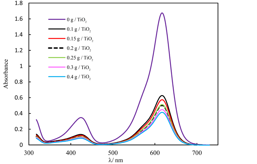 Figure 4. Effect of TiO2 dose on adsorption of malachite green onto TiO2 surface. [MG] = 5 × 10−5 mol∙dm−3, Temp. = 30˚C.