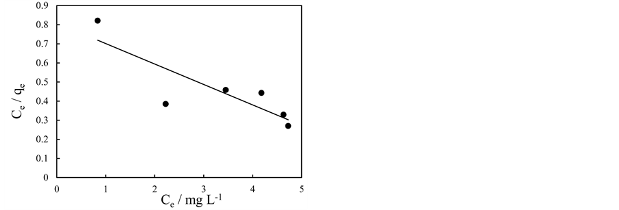 where the qmax (mg∙g−1) is the maximum adsorption capacity of the adsorbent corresponding to monolayer formation and illustrates the maximum value of qe that can be attained as Ce is increased. The b parameter is a coefficient related to the energy of adsorption and increases with increasing strength of the adsorption bond. Values of qmax and b are determined from the linear regression plot of (Ce/qe) versus Ce, Figure 6(a). Linear plot in negative direction indicates that Langmuir model fails to explain the process of adsorption and absence of formation of monolayer.