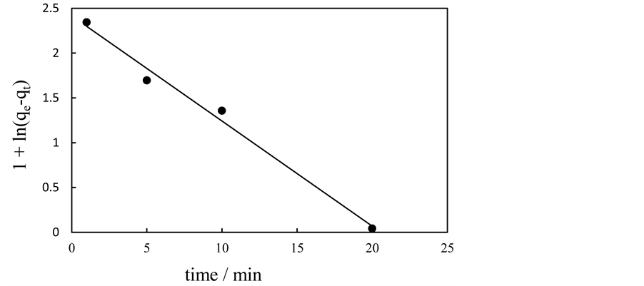 where k1 (min−1) is pseudo first order rate constant, qe (mg∙g−1) is the amount of dye adsorbed on surface at equilibrium, qt (mg∙g−1) is the amount of dye adsorbed on surface at time t (min). The adsorption rate constant, k1 and qe were calculated from the plot of log(qe − qt) vs t, Figure 7(a), and are listed in Table 3.