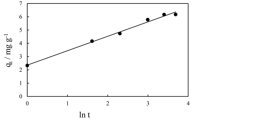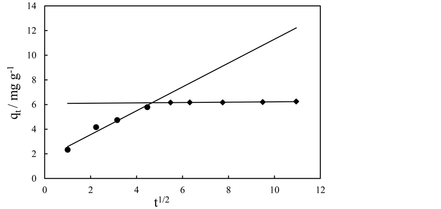 where, k2 (g∙mg−1∙min−1) is pseudo second order rate constant. The plot of t/qt vs t is shown in Figure 7(b). The values of qe and k2 are listed in Table 3. Although correlation coefficient of pseudo first order kinetics (0.988) is not lower than that of second order kinetics (0.999) but qe calculated from plot (6.369) is more consistent with qexp (6.25). Consequently pseudo second order kinetics is fitted.