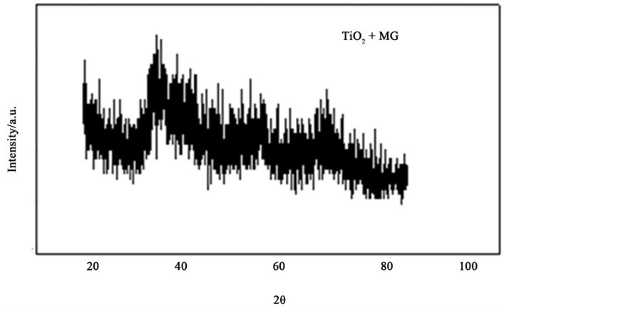 The extensive uses of industrial dyes in the fields of paints, cosmetics and food industry are accompanied by various risks on human health due to the stability and toxicity of these organic materials [1] - [3] . The effective removal of dyes from effluent is considered one of the environmental challenges in the recent years. Malachite green (MG) (Color Index No: 42,000) is one of triphenylmethane dyes, a green crystal powder with a metallic luster, highly soluble in water and ethanol with blue-green solutions [4] . Malachite green (MG) has numerous industrial applications (dyeing of silk, leather, plastics and paper). Their appearance is harmful for humans and animals following inhalation and/or ingestion [5] , produces toxicity to respiratory system and reduces fertility in humans [6] . The triphenylmethane dyes biodegradation due to presence of nitrogen in their back bone (generate carcinogenic, genotoxic, mutagenic and teratogenic problems) is a difficult task [7] . MG has high resistance to light and oxidizing agents, while its removal based on biological treatment and chemical precipitation has low efficiency [8] . It is now established that TiO2 is considered a promising semiconductor that is extensively involved in removal of several toxic organic containments through both adsorption and photocatalytic process due to the stability of its chemical structure, biocompatibility, strong oxidizing power, non-toxicity and low cost of the metal precursors [9] - [14] . TiO2 can be only triggered by UV radiation that encompasses only about 4% - 5% of natural solar radiation due to its wide band gap energy (3.2 eV). This defect limits the industrialization of this powder. Moreover, the mineralization processes through various redox reactions are encountered by the rapid recombination of the charge carriers. Another major defect in the preparation of nano titanium oxide through sol-gel route is the rapid hydrolysis of titanium alkoxide salts that lead to irregular condensation of hydroxide particles into amorphous solid [15] . This random condensation of particles is the primary cause for obtaining irregular particle and pore structure.
