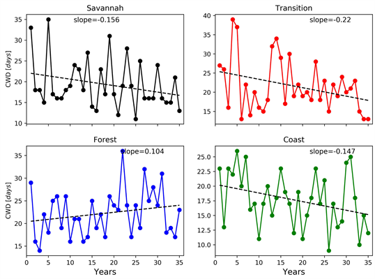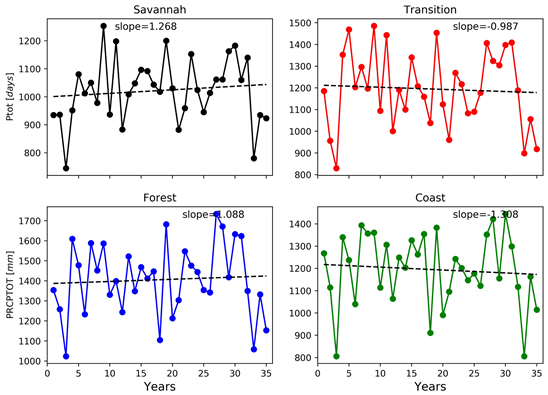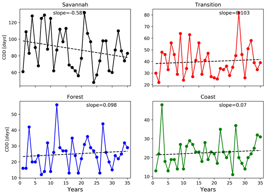 Figure 7 displays the trends of consecutive dry days in the four agro-ecological zones of Ghana for the period of 1981-2015. CDD defines the annual count of the maximum number of consecutive days with rainfall values < 1 mm. Positive trends of CDD are observed over the Transition, Forest and Coastal zones of the country. This increasing trend is further observed to be more pronounced in the Transition zone (0.103 mm per year), followed by the Forest zone (0.098 mm per year) then lastly, the Coastal zone (0.07 mm per year). The Savannah zone on the other hand is noted to experience a strong negative trend (−0.58 mm per