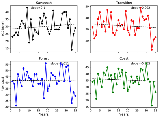 The number of heavy rainfall days is the annual count of days when the rainfall values are >10 mm. From Figure 9, it is observed that, both the Savannah and Transition zones show weak increasing trends of 0.100 and 0.092 per year respectively. An almost steady-increasing trend (0.011 mm per year) of the number of heavy rainfall days is observed over the Forest zone whilst on the other hand, a rather steady-decreasing trend (−0.055 mm per year) is observed in the Coastal zone of the country which is consistent with findings in [9] [17].