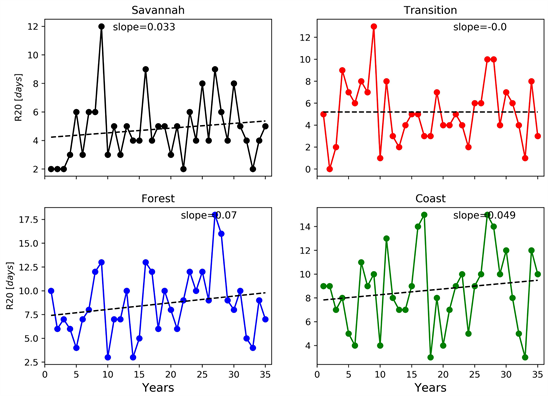 The number of very heavy rainfall which defines the annual count of days when the rainfall values are >20 mm is observed to show weak increasing trends in all agro-ecological zones except in the Transition zone of the country (see Figure 10). These findings support results reported in [17]. The number of very heavy rainfall is observed to show a steady trend in the Transition zone of the country.