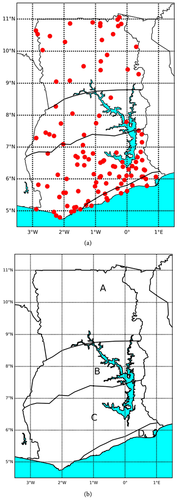 Figure 1. The study area showing the distribution of the 113-gauge stations over the country (in red) (a) with the delineation of the four agro-ecological zones of Ghana (b); Savannah zone (A), Transition zone (B), Forest zone (C) and Coastal zone (D).