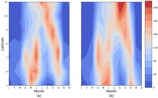 Figure 2. Inter-comparison of zonal mean rainfall over Ghana from GMet gauge data (a) and CHIRPS (b) for the period of 1998-2012.
