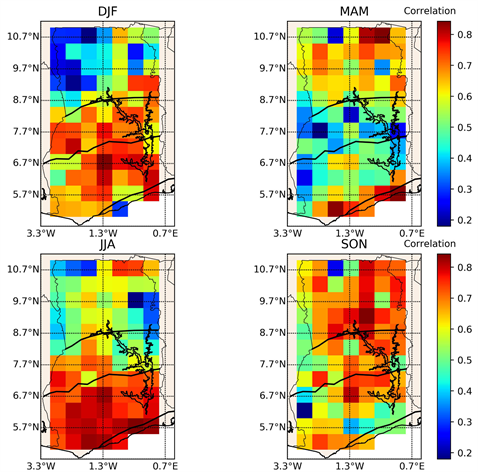 Figure 3. Pearson Correlation between GGGD and CHIRPS for the four seasons, DJF, MAM, JJA and SON throughout the entire country for the period of 1998-2012.