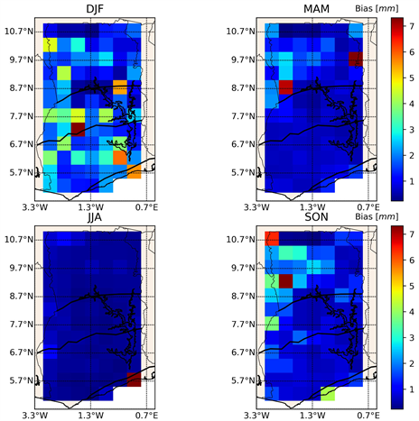 Figure 4. Bias between GGGD and CHIRPS for the four seasons, DJF, MAM, JJA and SON throughout the entire country for the period of 1998-2012.