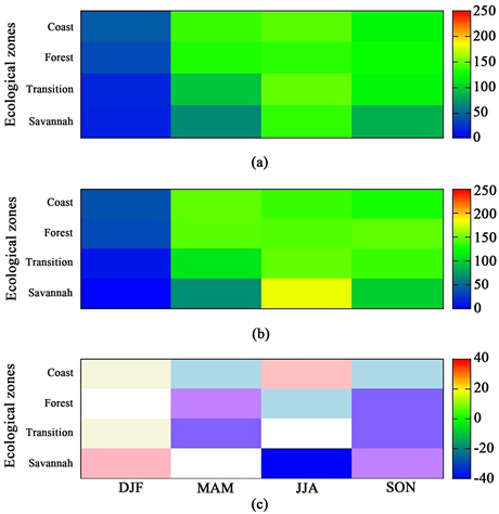 The MAM season is considered the rainfall onset period for most parts of the country. Rainfall values ranges between 60 - 200 mm throughout the entire country with low values dominating the Savannah zone and parts of the Transition zone whereas high values on the other hand dominate the south especially southwestern portions of the county. During the MAM season, the AP begins to weaken whilst the SH intensifies. Consequently, the southwest trade winds which are moisture laden begin to prevail over the dry north-easterlies thereby causing the ITD to migrate from its initial southern position to a more northward position thus, sweeping moisture into the southern parts of the country. The JJA on the other hand, happens to be the wettest period of the year throughout the country. Rainfall values ranges between 100 - 220 mm. The western coasts of the country are observed to record the highest rainfall values which range between 140 - 220 mm. The Savannah zone of the country is observed to record rainfall amounts in the range of 100 - 120 mm whereas the remainder of the country recorded an average value of about 140 mm. During this season, the AP becomes very weak whereas the SH becomes very intense thereby triggering the dominance of the southwest moisture laden trade winds over the entire country. This results to the migration of the ITD further north thus, releasing moisture over most parts of the country.