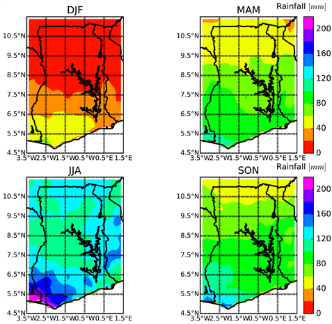 The mean seasonal rainfall patterns over Ghana are shown in Figure 6. The DJF season happens to be the driest season throughout the entire country. Relatively high rainfall amounts ranging between 60 - 80 mm dominates the southwestern parts of the country in this season. The remaining parts of southern portions of the country have rainfall values between 20 - 80 mm. The lowest rainfall values (≤20 mm) are recorded over the upper Transition and Savannah zones of the country which is similar to observations in [9]. This dryness in the DJF season is as a result of the intensification of the Azores pressure (AP) (located about 30˚N of Atlantic) and the weakening of the St. Helena (SH) (located about 25˚S of Atlantic). The pressure patterns in these zones results in the prevalence of northeasterly trade winds (dry and dusty in nature) over the entire country thus causing the Inter-tropical Convergence Discontinuity (ITD) to migrate southward beyond Ghana.