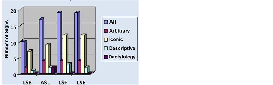 Figure 4. Comparison of the number of signs found for 33 Olympics sports in the Brazilian (LIBRAS = 10), American (ASL = 17), French (FSL = 19) and Spanish (SSL = 19) sign languages. Most signs are Iconic (yellow) and Arbitrary (brown).