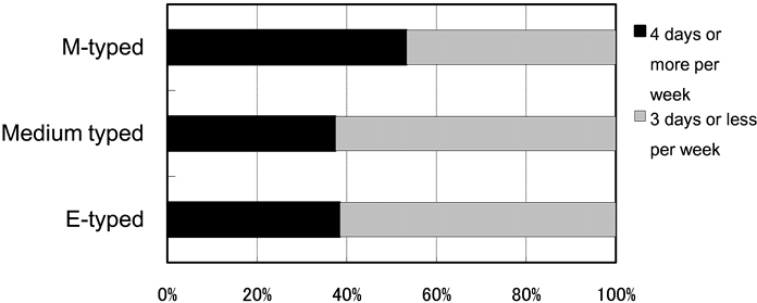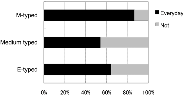 to take breakfast with “nutritionally rich breakfast” including stable (carbohydrate), main dish (protein) and side dish (vitamins and minerals) among the three chrono-types tended to be higher in the morning-typed group than the other two groups (χ2-test, χ2-value = 1.053, df = 2, p = 0.591) (Figure 4 and Figure 5).