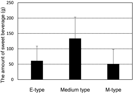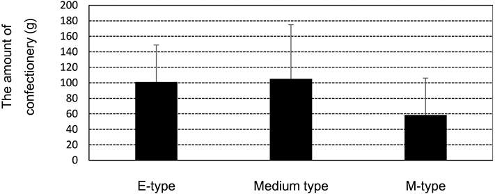There were no significant differences in the ratio of participants to eat refreshments between meals and to take beverage (excluding water, tea and coffee) among the three chrono-types (χ2-test, refreshments: χ2-value = 2.188, df = 4, p = 0.701; beverage: χ2-value = 5.634, df = 4, p = 0.228). Although there were no significant differences in the amount of carbohydrate to be taken at meals due to the small number of participants, the morning-typed tended to take lower amount of carbohydrates at meals than the evening-typed one (Table 1). Evening-typed university athletes took more amount of confectionery and sweet beverage than morning-typed ones (Kruskal- Wallis test, confectionery: χ2-value = 7.54, df = 2, p = 0.023; beverage: χ2-value = 9.46, df =2, p = 0.009) (Figure 6 and Figure 7).