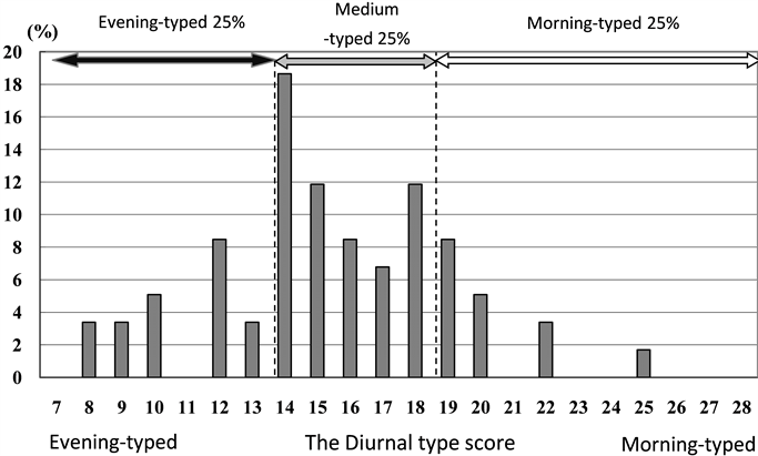 Figure 1. Distribution of the Diurnal Type Score constructed by Torsvall & Åkerstedt (1980) shown by Japanese university soccer club members (all males).