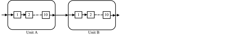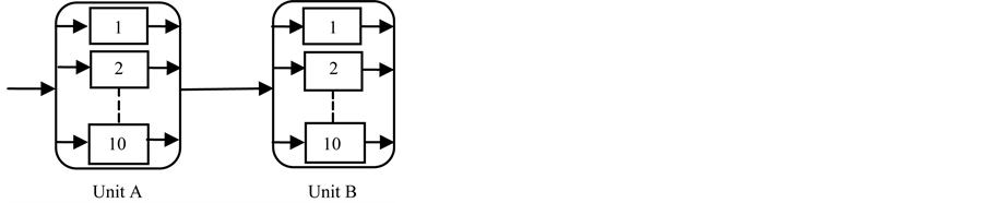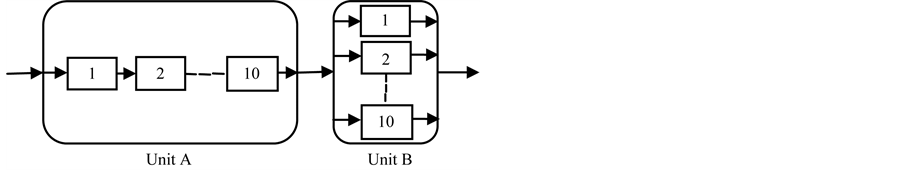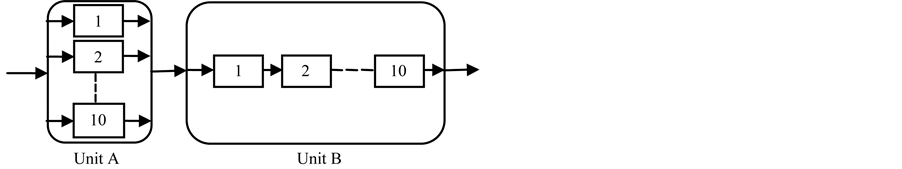 Case II: k = 1 and l = 10 represents the system, where all components of unit A are connected in parallel and that of unit B are connected in series as shown in Figure 6.