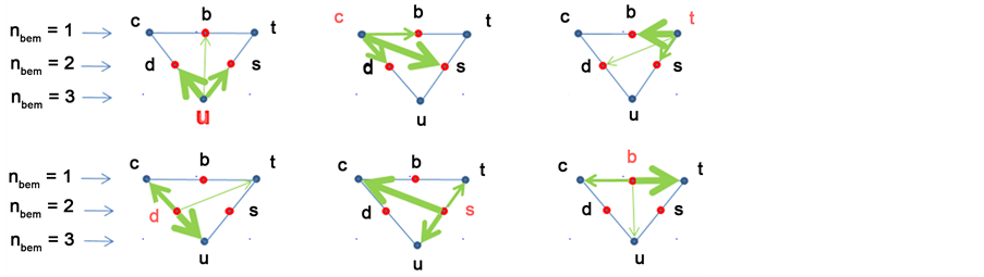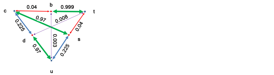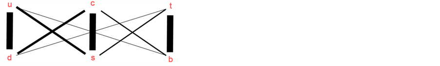 Figure 4. The standard Cabibbo−Kobayashi−Maskawa matrix incidence matrix display. Figure 4 is a standard array of the Cabibbo-Kobayashi-Maskawa matrix (CKM) matrix. It demonstrates the relative likelihood of transformation of one quark to another. The thicker the incident arc the greater the probability of a transition. This is a very specific pattern with the up quarks on the top row and the down quarks on the bottom. The up quarks transform only into down quarks and vice-versa through weak force transitions.