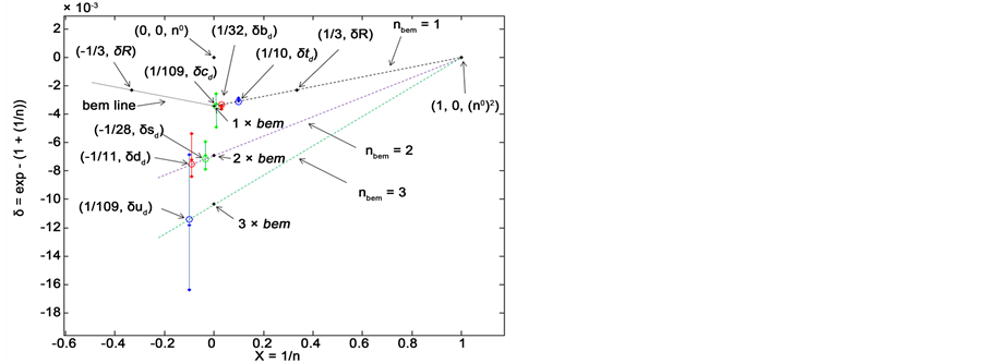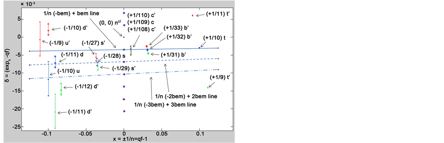 Figure 2. Natural power law and prime number factor imperative. Figure 2 is the power law line plot of the quarks. The X-axis equals 1/n and the Y-axis equals the δ values, the exponent minus the partial harmonic fraction,