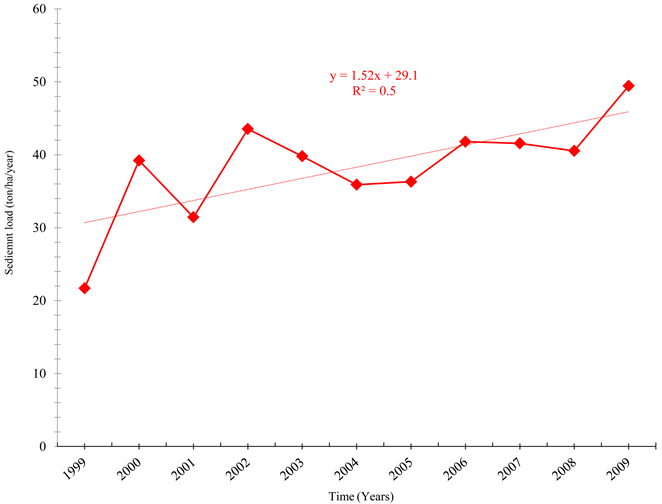 slope of 0.64 (based on the Mann-Kendall trend test) clearly showed that the average turbidity lake water was increased (Figure 6). The average sediment inflow of 38-ton ha−1・yr−1 into the lake was estimated from [44] which were 46% higher than the country average of 26-ton ha−1・yr−1. The calculated annual sediment inflow showed the same trend as those observed in the 3 clusters for the same time period (Figure 6).