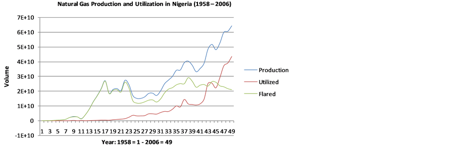 during the first ten years of production, there was zero gas utilized and a geometrical increase in the produced and flared gas. Following this period, a steady increase in the amount of gas utilized while a gradual decline was observed for produced and flared gas for about ten years. However, the plot flattens during the last ten years showing that the volume flared remained constant whereas there was a corresponding sharp increase in the volume utilized with production. Some spikes on the plot at points 16, 23 and 38 corresponding to 1974, 1981 and 1996 represent the highest volume of gas flared. The amount of gas flared was higher than those utilized until 2004.