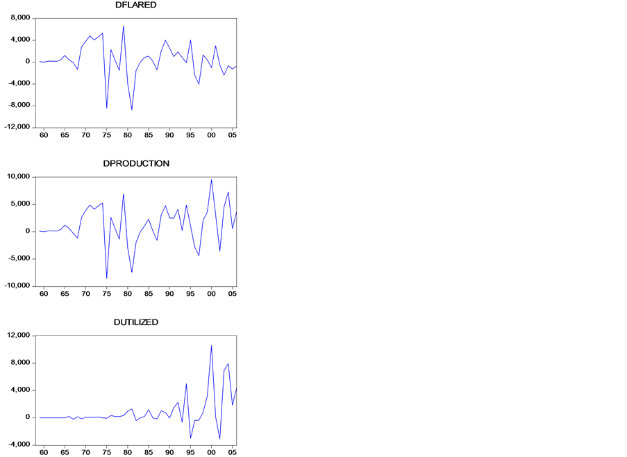 Figure 1 is a time plot of the production, utilization and flared natural gas in Nigeria oil and gas industry. The time plot of all the variables that are of interest in the study shows that gas utilization and production rate steadily accelerated upward from the base year till the end. More so, flared gas also had an upward trend except that it is an oscillatory trend. At times it rises and fall but later maintained the upward trend. The plot shows that