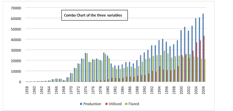 Figure 3 is a combo chart which helps us to see the relationship among production, utilized and flared gas during the period of investigation.