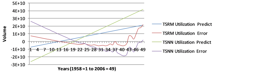 Figure A4. Prediction and Error of Natural Gas Utilization in Nigeria (1958-2006) using TSRM and TSNN.