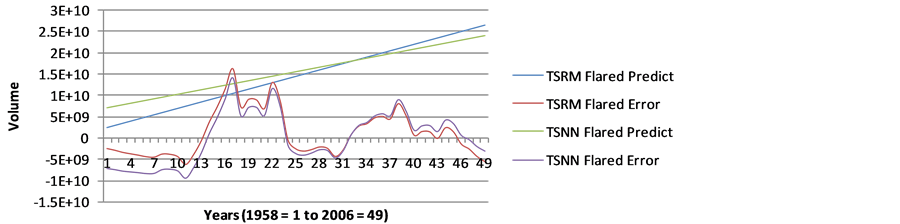 Figure A5. Prediction and Error of Natural Gas Flared in Nigeria (1958-2006) using TSRM and TSNN.