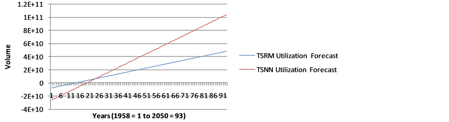Figure A7. Forecast of Natural Gas Utilization in Nigeria (1958-2050) using TSRM and TSNN.