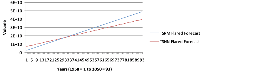 Figure A8. Forecast of Natural Gas Flared in Nigeria (1958-2050) using TSRM and TSNN.