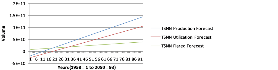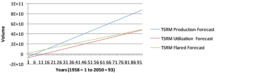 Figure A9. Forecast of Natural Gas Production, Utilization and Flared in Nigeria (1958- 2050) using TSRM.