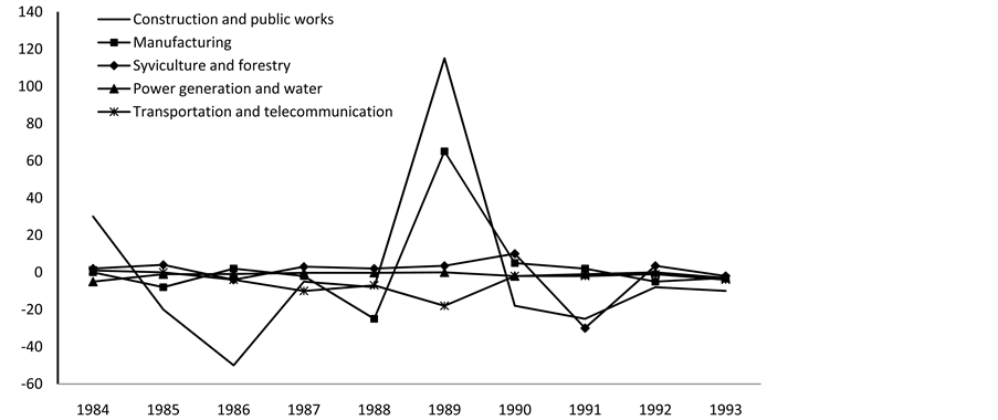 The data was provided by the Congolese National Institute of Statistics. These are estimations made from the results of annual and market investigations at public and private companies. They have to do with five sectors of the Congolese economy over a period from 1983 to 1993. There are five sectors: (i) syviculture and forestry; (ii) manufacturing; (iii) power generation and water; (iv) construction and public works; (v) transportation and telecommunications. For the five sectors investigated, we note a labor force that is reduced overall by 16% (15% for syviculture and forestry, water and power generation, 65% for construction and public works, and 18% for transportation and telecommunications).