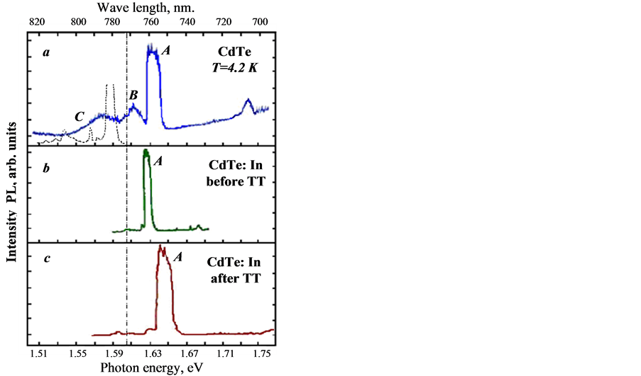 The LTPL spectrum of the CdTe:In film subjected to TT under optimal conditions does not change radically (Figure 1(c)). However, it should be note that TT leads to broadening of the A line by a factor of almost 3