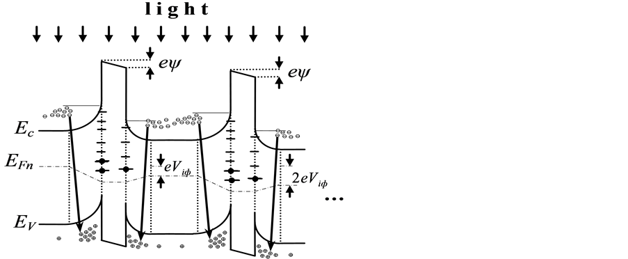 Figure 2. The band of diagram energy of the linear chain semiconductor crystalline grains with asymmetric potential barriers among intercrystalline interface (IL), at illumination by light, bring to APV and PL generation.