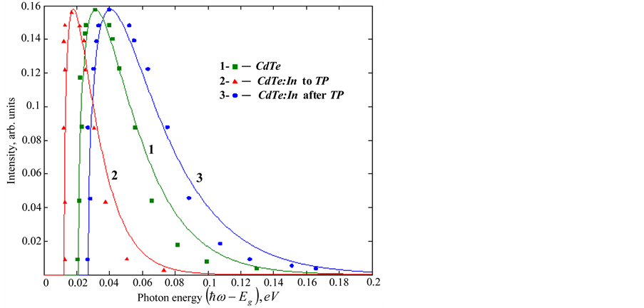 The theoretical (according to (3)) and experimental spectra of the fundamental LTPL band of fine-grained CdTe and CdTe:In films with APV properties are compared in Figure 4. The values of the parameters