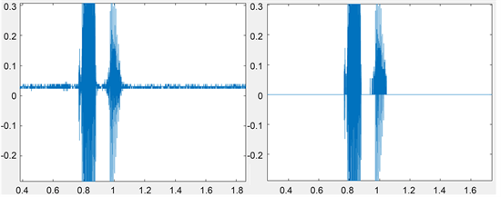 Background noise is a major factor contributing to the difficulties in analyzing voice signals. This is attributed to the fact that background noise contributes unintended parameters from the surroundings that becomes unwanted information in the speech input. As shown in Figure 9 the graph (left) includes very low amplitudes of the input signal during the entire recording period. Thus, in the system, very low amplitudes of the signals are considered as background noise, which are removed before performing any other steps as shown in Figure 9 (right). In addition, this would allow the system to have better tolerance of variations like extraneous conditions.
