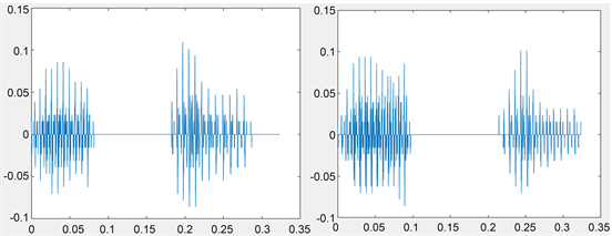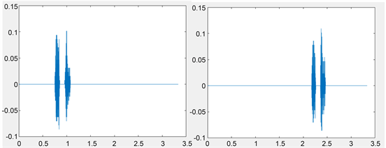 In the system, any user can say the given words at any different time. As shown in Figure 10 (left), one user started saying “apple” at 0.7 second for his reference model. However, as shown in Figure 10 (right), the next time, the user started saying “apple” after 2 seconds. In this case, these two voice signal graphs are not useful for comparison due to the initial time difference. Thus, the author decided to set the region of interest by discarding the unnecessary information and shifting the time domain. Using the MATLAB program, the author obtained time shifted speech signals as shown in Figure 11.
