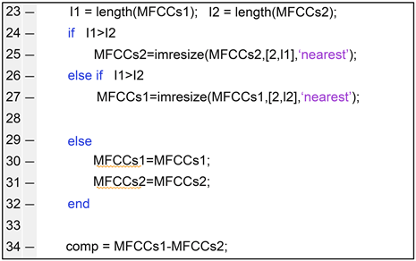 Figure 15 is the MFC Coefficient matrix stretching code that the author built. First, the lengths of both matrices are obtained in line 23. Through line 24 to 27, the algorithm compares each length of the matrix and then the shorter length of the matrix is stretched out to the same length as the longer matrix. Through line 29 to 31, if both matrices already have the same lengths, they maintain their original lengths. From now on, they have the same lengths meaning that they are ready to be compared (see Figure 16).