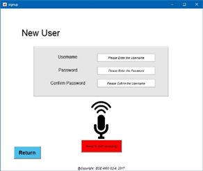 This window, shown in Figure 5, would be applied whenever the user would like to sign up a new account to access the system. It would ask user for a unique username for their account and set the validation information, the password and voice key. The system would not create any account if the username is not unique in the system or the password has not been entered differently when it is being confirmed.