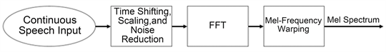 In the frequency domain, the proposed design includes a feature extraction algorithm as shown in Figure 8. In this algorithm, the most important part is Mel-Frequency Warping. Mel Frequency Warping will allow us to obtain better representation of sound, especially in audio data compression. It contains several steps shown below: