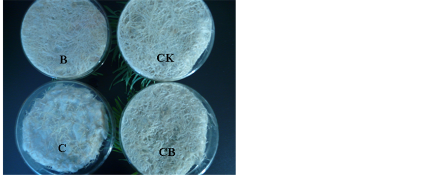 Figure 1. Seedling development in various treatments. CK: dis- tilled water only; B: distilled water with ultraviolet-B radiation; C: Cu2+ application only; CB: Cu2+ with ultraviolet-B radiation.