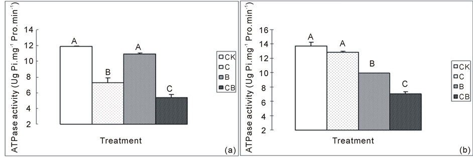 Figure 2. ATPase activity in various treatments. (a) Activity of ATPase in plasma membrane of seedling root; (b) Activity of ATPase in thylakoid membrane of wheat leaves. CK: distilled water only; B: distilled water with ultraviolet-B radiation; C: Cu2+ application only; CB: Cu2+ with ultraviolet-B radiation. Each bar is the mean ± SD (n = 3) for each treatment. Bars with various letters denote significant difference at p < 0.05.