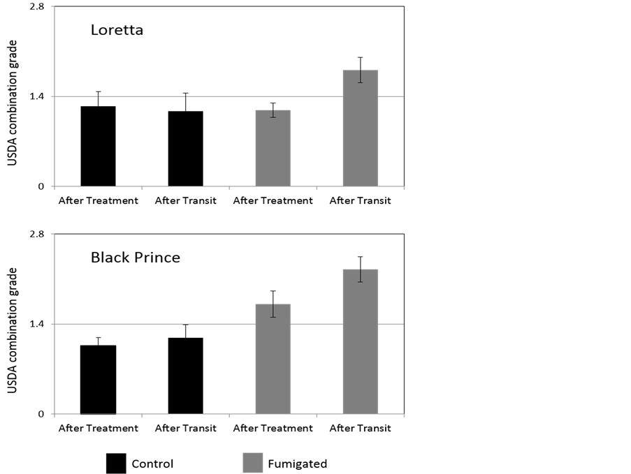 “Loretta” and “Black Prince” fruit were subjected to T108-a-2 (2.5 h methyl bromide fumigation + 4 d cold storage at 4.4˚C). Loretta fruit showed no significant external damage immediately after completion of the fumigation and cold storage components of the treatment. The rating of 1.18 CG was below the acceptable higher limit of 1.4 CG. However, after the transit period, fruit showed serious damage caused by anthracnose and reached a rating of 1.81 CG (Figure 1). In addition, 88% of the treated fruit showed internal damage after the shelf period clearly indicating that treated fruits were unmarketable. By contrast, non-fumigated Loretta control fruit remained marketable showing 1.25 and 1.16 CG ratings after the treatment and transit periods (Figure 1), and an 8% internal damage rate after the shelf period. Similarly, “Black Prince” fruit showed ratings of 1.70 CG after treatment and 2.25 CG after the transit period. The external fruit quality did not meet the U.S. combination immediately after treatment. By