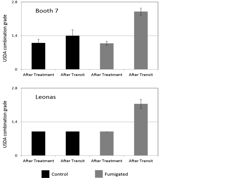 Figure 3. “Booth 7” and “Leonas” fruit subjected to treatment T101-c-1 (4 h methyl bromide fumigation). A combination grade of 1.4 or lower indicates whether the fruit is acceptable for commercialization. Error bars represent 95% confidence intervals.