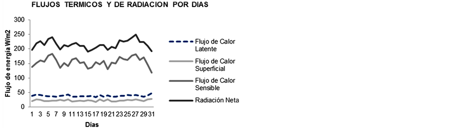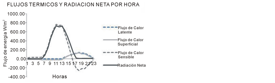 The variation of heat fluxes by hours, is more significant during different times of the day; 10:00 am and 15:00 pm the most intense, in the case of sensible heat and net radiation, while the latent heat flux and surface increase in the night (Figure 2).