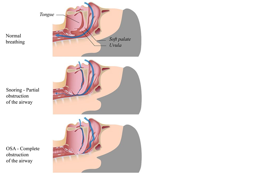 Figure 1. Obstructive sleep apnea (OSA) is characterized by repetitive episodes of complet (apnea) or parcial (hypopnea) upper airway in obstructive sleep apnea occurring during sleep. The major predisposing factor for OSA is excess body weight (60% atributtable to obesity), other factors are excess of soft tissue (tongue, soft palate and lateral pharyngeal walls) and craniofacial anatomy.
