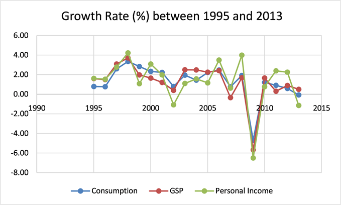 Figure 1. Average growth rates between 1995 and 2013. This figure depicts the national average growth rate (including 50 States and Washington DC in the USA) (in %) in economic indicators including consumption, gross state production, and personal income between 1995 to 2013. The growth rates are computed based on per capita data of annual state-level macroeconomic measurements obtained from Bureau of Economic Analysis (BEA), and deflated to 1970.