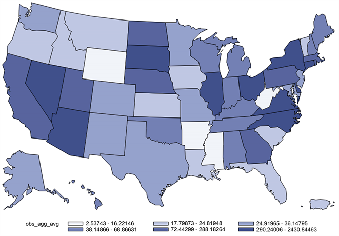 Figure 1 displays the average growth rates of state output (GSP), consumption spending (CON), and personal income (SPI) across states for each year from 1995 to 2013. The figure reveals a lead-lag relation between the growth rate in GSP and the growth rates in personal income and consumption. Whenever GSP growth rate showed a big dip, for example in years 2000, 2002 and 2007 respectively, we observe a lagged reduction in the growth rates of personal income and consumption, reflecting the fact that personal income and consumption are largely affected by the macroeconomic conditions. Figure 2 geographically displays the average use of financial innovation by states in a heat map view. It is revealed that the regions along the East and West coasts tend to have a larger use of financial innovation, comparing to the states in other regions.